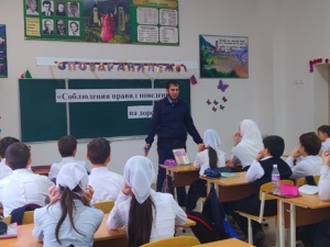 Инспектор по пропаганде БДД ОГИБДД ОМВД России по Грозненскому району лейтенант полиции Толдиев А.С. провел с обучающимися 6а класса на тему: «Соблюдения правил поведения на дороге»