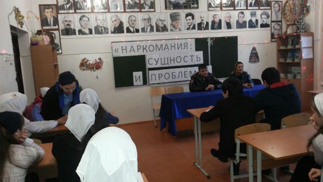 30.01.2015В целях профилактики наркомании и привития ЗОЖ проведено профилактическое мероприятие «Наркомания: сущность и проблема», в рамках реализации плана Единой концепции духовно-нравственного воспитания и развития подрастающего поколения. Инспектор ПДН Тимаев А. и Джабраилова З. провели профилактическую беседу с обучающимися 9 классов.