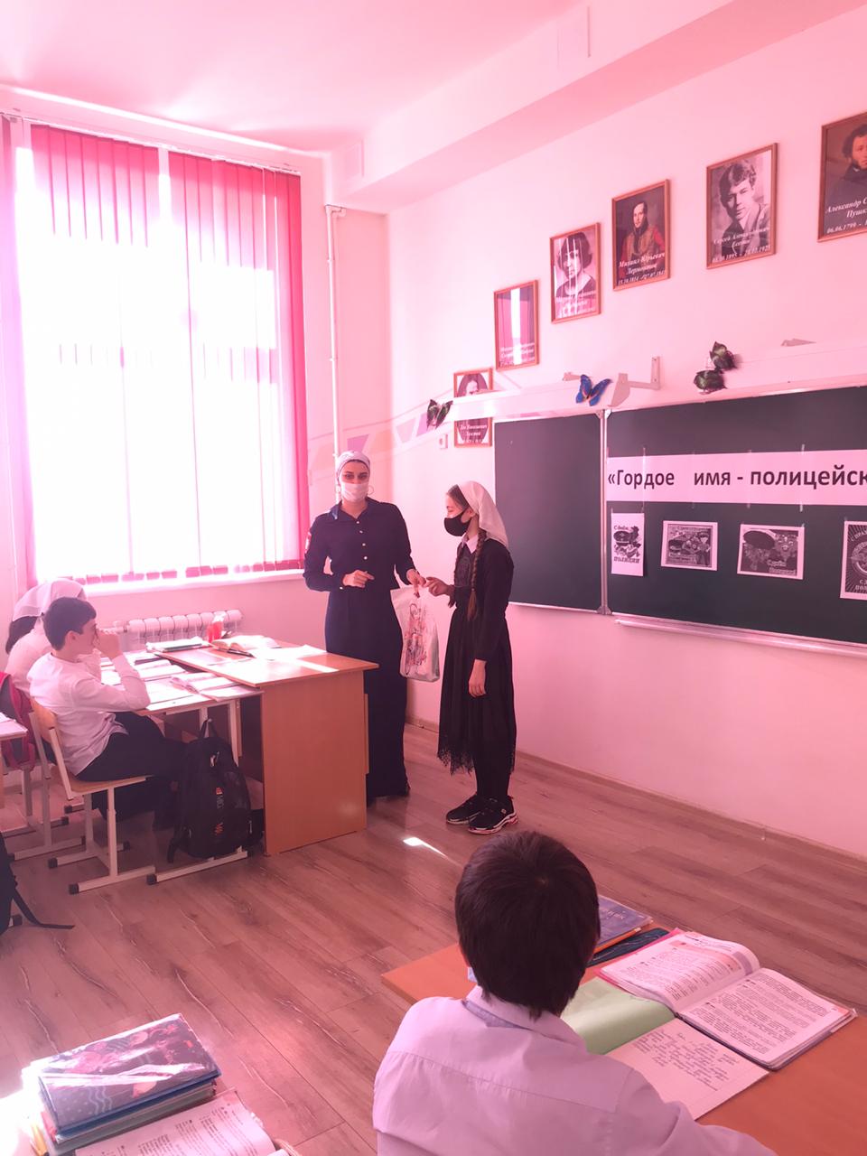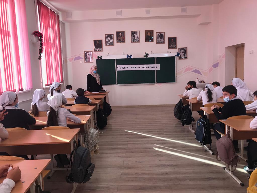 2. Была организована встреча обучающихся с инспектором ПДН ОМВД по Грозненскому муниципальному району младшим лейтенантом полиции Дурдаевой Р.Т., которая провела беседу с обучающими 6-х, 7-х классов на тему: «Гордое имя Полицейский» Она рассказала, о важности профессии, о ее незаменимости.