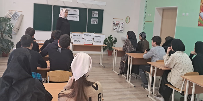 В ходе мероприятия они обсудили актуальность проблемы отходов в Росси и мире. Зарема М. рассказала о масштабах данной экологической проблемы, рассказала, что такое «раздельный сбор» отходов и для чего нужно это делать. Также обучающиеся изучили вопрос потребления биоразлагаемой тары и упаковки. мероприятие сопровождалось презентацией. После чего обучающиеся закрепили полученные знания в игровом задании, где необходимо было сортировать мусор и рассказать о сроках разложения данного вида отхода. А также узнали о «второй жизни» мусора. В конце мероприятия обучающиеся получили памятки о правильно обращении с ТКО.