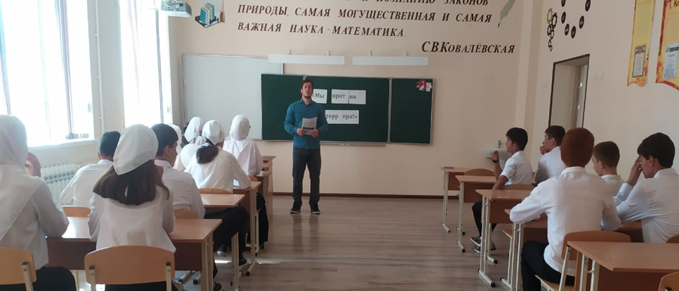 01.09.20231 сентября в 9-х и в 11-х классах проведены классные часы, посвящённый Дню солидарности в борьбе с терроризмом: «Терроризм-угроза обществу», «Мы против теСкажем терроризму – нет!», «Так не бывает, в детей не стреляют».