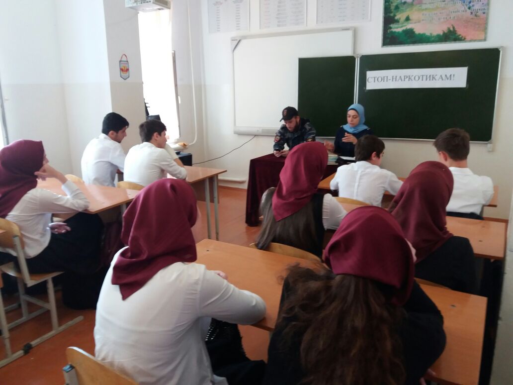 Старшим лейтенантом Таймысхановой З.А. и капитаном полиции Магомадовым И. проведена информационно-разъяснительная работа с обучающимися 9, 11 классов по профилактике и предупреждению употребления наркотических веществ.