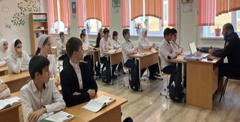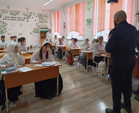 2. Инспектором ОПДН ОМВД России по Грозненскому району лейтенантом полиции Гиназовым А.И, совместно с заместителем директора по воспитательной работе Ильясовой А.У. проведена беседа с учащимися 8-х классов на тему, профилактики вредных привычек и правонарушений среди подростков. Беседа прошла с целью развития у несовершеннолетних осознанно сформированной потребности в здоровом образе жизни, ответственности за свою жизнь и здоровье.