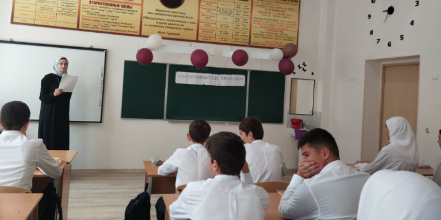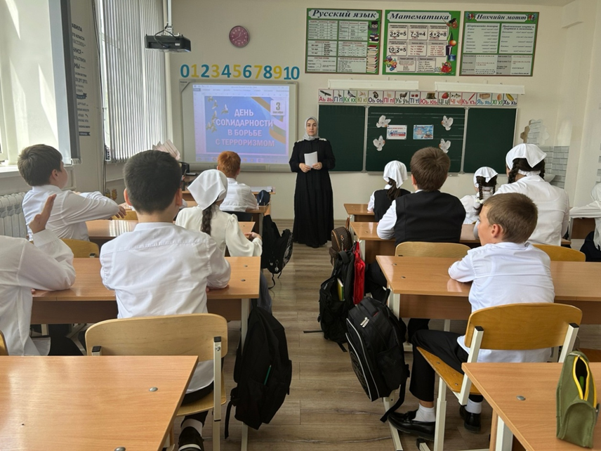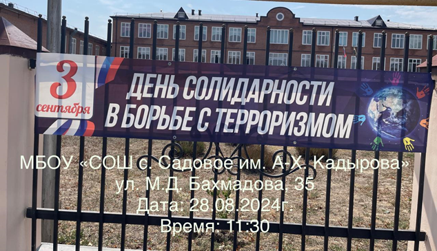 03.09.2024Согласно планам мероприятий, посвященных Дню солидарности в борьбе с терроризмом Администрации Грозненского муниципального района, МУ «Грозненский РОО», плану работы школы, 03.09.2024 в МБОУ «СОШ с.Садовое им А-Х. Кадырова» прошли мероприятия данного тематического содержания.