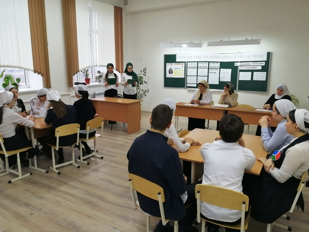 Активисты отряда «Юные Кадыровцы» Хунарикова Х. И Сулейманова Х. Провели мероприятие среди обучающихся 8-классов. Участники мероприятия узнали много интересного из жизни великого ученого. От каждого класса были команды 8 «а» класс – «Алмаз», 8 «б» класс – «Ион» между командами прошли конкурсы. Лидировала команда 8 «а» класса.