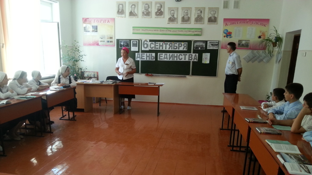 На всех мероприятиях было отмечено, что: «6 сентября – особая дата для жителей Чеченской Республики, потому, что это мир, это процветание, это жизнь! Указ об учреждении этого праздника был подписан в 2002 году, Первым Президентом Чеченской Республики, Героем России Ахмат-Хаджи Кадыровым. И вот с этого Указа, с Указа Ахмат-Хаджи об учреждении Дня Чеченской Республики началась консолидация народа Чечни». На встрече с представителями парламента ЧР, силовых структур, духовных лиц района, прошедшей в рамках празднования Дня Республики в актовом зале школы, Б.Хасбулатов сказал, что «Первый Президент Республики был уверен, что только совместными усилиями, без разделения народов, проживающих на территории Чеченской Республики, по национальному вопросу, можно сохранить мир и единство многонациональной Чеченской Республики. День народного единства Чеченской Республики стал символом национального единения и общей ответственности людей». Основной целью круглого стола «6 сентября- День гражданского согласия и единения» было раскрытие сущности единства. Было отмечено, что: «На сегодняшний день в ЧР проживают представители 96 национальностей, которые бережно хранят свою самобытную культуру, национальные обычаи и традиции, и никто не обделен чем-то, не унижен. Для всех народностей, без исключения, созданы культурные центры, где они могут сохранять и пропагандировать свою культуру и национальные традиции». Организаторы встреч, круглых столов, учащиеся, гости – все сошлись в едином мнении, что согласие и единство многочисленных народов, проживающих на территории Чеченской Республики, есть фундамент, на котором зиждется мир, спокойствие и благополучие Республики. Ибо, в единстве людей, в единении народов - сила Чеченской Республики.